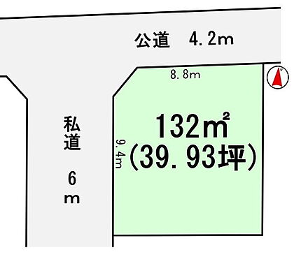 【接道】 二方 ( 公道 北 4.2m ) ( 公道 西 6m ) 現況引渡し 上下水道引き込み要 |