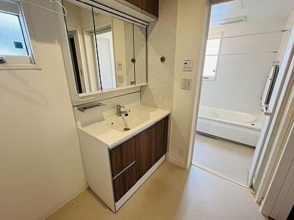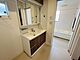 大きな鏡の付いた洗面化粧台!収納力もあり消耗品などがスッキリ収納できます♪