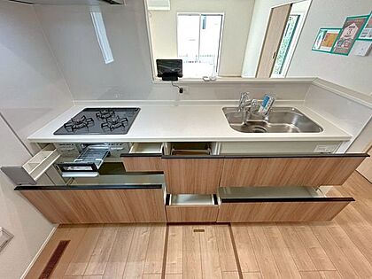 システムキッチンは、ゆとりのサイズをセレクト。吊り戸には耐震ラッチ、キッチンカウンター下には大容量の収納スペースを確保。キッチンに立つことがますます快適になります。