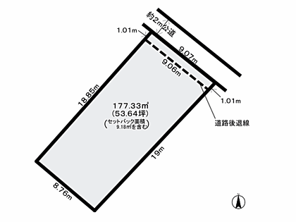 | 土地面積/坪(坪単価) | 177.33m2(登記簿)/53.74坪(9.10万円) | 代表的な接道 | 一方 公道 北東 2m ※詳細は備考欄をご確認ください |