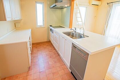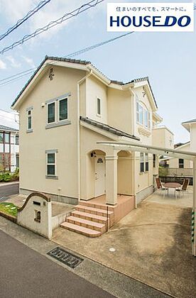 南欧風のやさしい色合いが印象的な外観♪玄関アプローチにはタイルステップを使用し、来客時にも好印象。駐車スペースはゆとりがあり、お庭スペースではテーブルを囲んでティータイムも楽しめます。