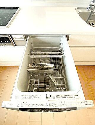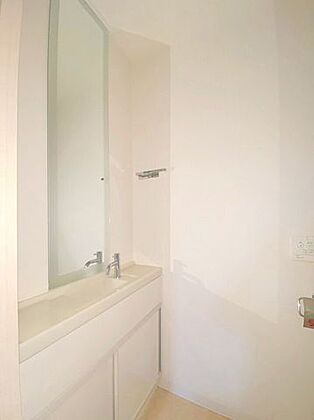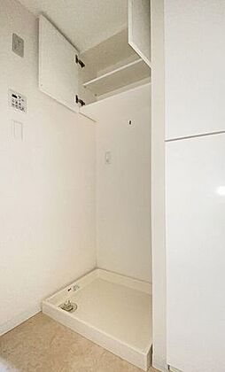 防水パン完備の室内洗濯機置場上部収納棚も使い勝手◎