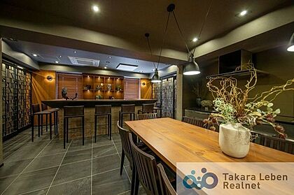 共用部のパーティールーム。ゆったりとした大人のための静謐な空間として活用いただけるバーカウンターも設置しております。歓びが響き合う、特別な時間をお過ごしください。