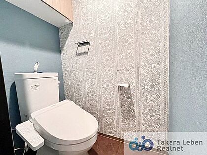 トイレルームはおしゃれなアクセントクロスを採用しております。リラックス効果のあるブルーカラーが目を惹きます。