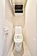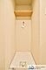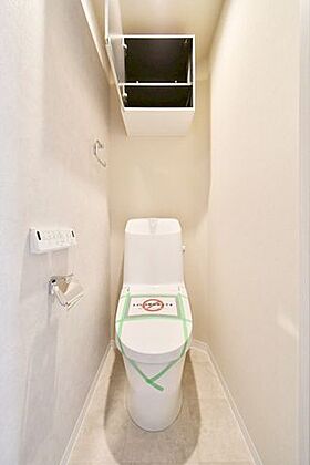 ウォシュレット機能付きのトイレ。収納付きで、便座がスッキリした印象となり、限られた空間を広く見せる効果があります。