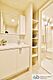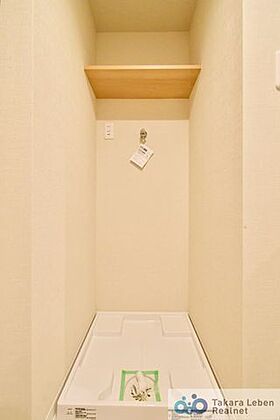 洗濯機置き場の上部には収納棚を設置。洗剤や掃除用具などもスッキリ収納できます。