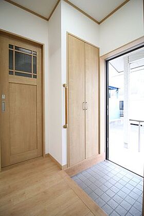玄関には収納スペースがございます。大容量の収納スペースでスッキリ片づけることができそうですね。