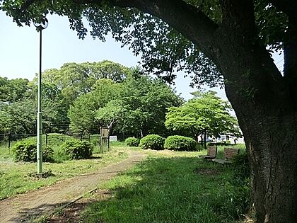 五所塚第一公園まで502m、大きな樹の下のベンチには木陰が出来て一休みするのにちょうどいいです。ベビーカーも入れます。