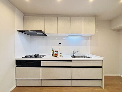 収納量豊富なシステムキッチン。カウンターキッチンと違い、背面を広く使えるので自由度が高いのも嬉しいですね。