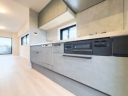 【キッチン4帖】三口コンロで料理の幅を拡げてくれる使いやすいシステムキッチンを採用。洗い場も大きいので野菜や食器を洗ったりする際にも捗り、奥様の強い味方となってくれるはずです。