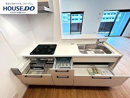【今日のゴハンは何食べたい?】重たい鍋や大きなフライパンの収納はキッチン下のスライド収納へ。ちょっとした家事の手間を楽にする、家族みんなが使いやすいキッチンです。