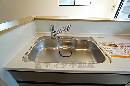 •  広々とした凸型シンクに洗剤ポケットを標準装備。大きなお鍋など洗いやすいです。洗剤や石鹸、スポンジもすっきりできる収納付き。