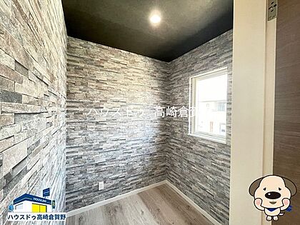 石目調クロスがアクセントの、落ち着いた雰囲気の書斎スペース。集中できるこもり感と窓からの自然光で、在宅ワークや趣味部屋にも最適です。