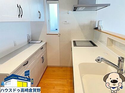 キッチンは白を基調とした清潔感溢れるデザインが特徴。さらに、収納スペースが豊富で、キッチン周りの小物や調理器具をすっきり整理できるため、使いやすさと美しさを両立しています◎