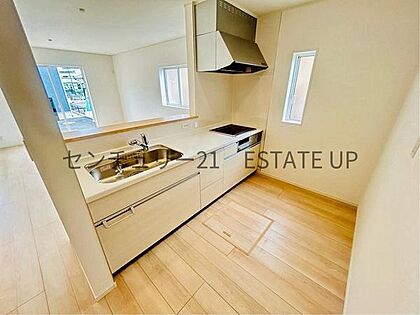 【キッチン】リビング全体を見渡せる対面式キッチン。リビングで過ごすご家族を見守りながら作業ができ、お互いの顔を見ながら会話ができます。上部に吊り戸棚がなく、開放的です。