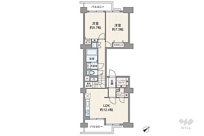 間取りは専有面積77.22平米の2LDK。バルコニー面積は17.66平米です。
