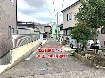 【接道】 一方 ( 私道 位置指定 北西 4m ) ・都市ガス:前面道路まで 準防火地域、景観法、秋田市中高層の建築に係る紛争の予防および調整の条例 |