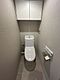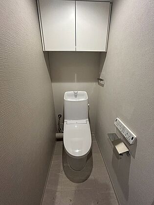 快適に使用可能な温水洗浄便座付きのトイレ。背面に吊戸棚が備わり、トイレットペーパーなどを保管可能。【トイレ】