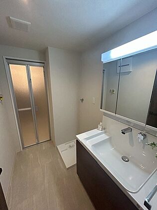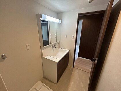 身支度の際に重宝する3面鏡付きの洗面化粧台です。鏡裏とボウル下に収納が備わり、洗面用品を収納可能。【洗面所】
