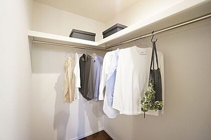 【施工例/ファミリークローゼット】家族全員の衣類や荷物を一箇所にまとめて収納できるファミリークローゼット。洗濯から収納までの家事動線が短くなり、家事の負担が軽減されます。