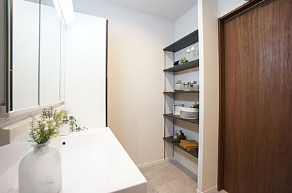 【施工例/リネン収納】タオルやパジャマ、洗剤などをまとめて収納することで、洗面室がすっきりと片付きます。また、他の部屋から荷物を持ってくる手間が減り、生活動線がスムーズになります。
