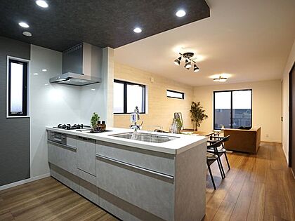 【施工例/キッチン】ゆったりとした広さのあるキッチン。ご夫婦で一緒に並んで洗い物できる大きさです。水栓はデザイン性も高く使い勝手の良いと人気のグースネック型を採用。