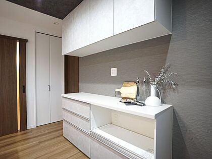 【施工例/カップボード】カップボードは縦に収納スペースを確保できるため、限られたキッチンの床面積を有効に使えます。壁付けの収納なので、食器棚のように地震の際に倒れる心配もありませんね。