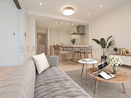 寒い季節も足元からぽかぽかあたたかい、床暖房完備のLDK※家具等はCGによるインテリアイメージです。家具の設置サイズを保証するものではなく、TV配線には配慮しておりません。