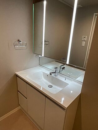 3面鏡裏収納付の洗面化粧台 ツインライン照明