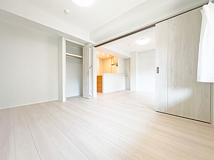 リビング隣の約6 帖の居室。可動間仕切りは、急なご来客時のお荷物の逃げ場にもなっております。クローゼットを完備。2025/7/5撮影