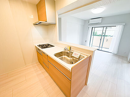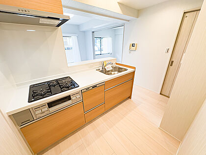 笑顔がよく似合う、そんな明るい雰囲気のキッチンスペース。毎日の料理が楽しくなりそうな期待感に満ちています。食洗器・浄水器を完備。2025/7/5撮影