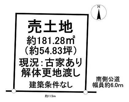 | 土地面積/坪(坪単価) | 181.28m2/54.93坪(27.30万円) | 代表的な接道 | 公道 南 6m ※詳細は備考欄をご確認ください |