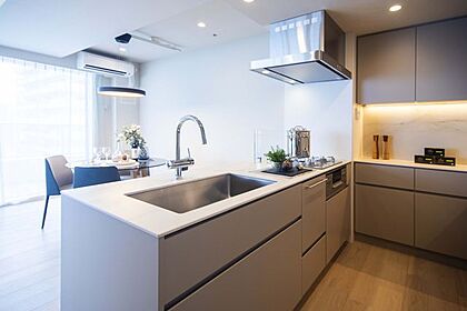 グローバルベイスオリジナル田中工藝製システムキッチンを新規設置しました。室内の色合いに調和した、デザイン性の高いキッチンです。