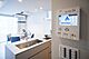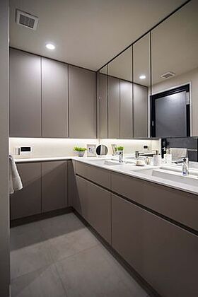 洗面化粧台は、キッチンと同じく田中工藝製で上品さが宿ります。大きな三面鏡で身だしなみのチェックもしやすい洗面台です。三面鏡裏が収納で、小物類が多い洗面まわりもすっきり整頓できます。