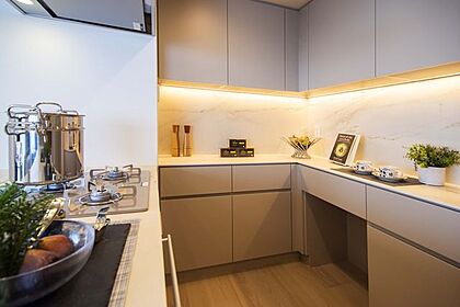 背面にはキッチンと収納豊富なお揃いのカップボードがあり、カウンターにはケトルやトースター、電気調理器など、お洒落家電をディスプレイできます。