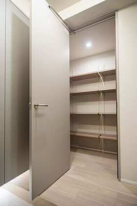 玄関からアクセスできるシューズインクローゼットです。豊富な可動棚付きでシューズはもちろん、アウトドアグッズや雨具なども収納可能です。