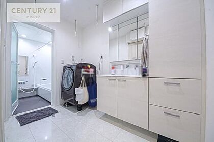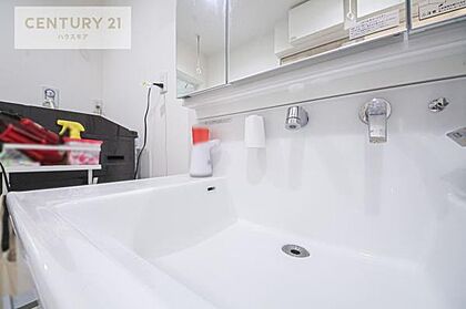 三面鏡仕様の洗面所は、身だしなみがしやすい造り!裏は収納になっています。ドライヤーやお化粧道具を片付けられるので洗面台周りをスッキリと見せることが出来ます!