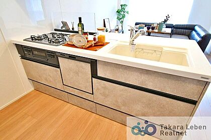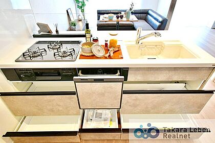 嬉しい3口コンロ。ビルトイン食器洗浄機の為場所を取らず忙しい朝も快適になります。また、収納はスライド式の為、奥にしまい込んだ調理器具等の取り出しもスムーズに行えるため、調理がはかどりますね
