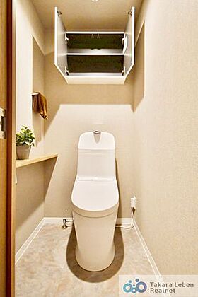 ウォシュレット機能付きのトイレ。収納付きで、便座がスッキリした印象となり、限られた空間を広く見せる効果があります。