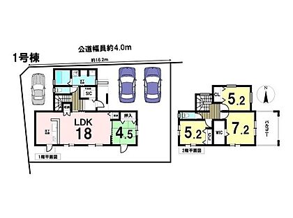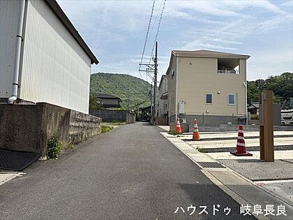 北側前面道路幅約4mです。車がすれ違うには厳しい道幅ですが、車はスピードを抑えて走行するので、お子様にも安全な道幅となっています。