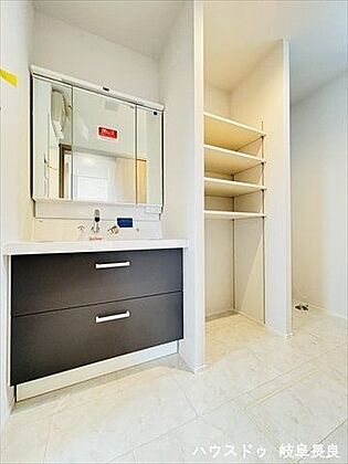 3面鏡にハンドシャワー付き。使いやすくお掃除しやすい洗面台です。鏡の裏側や、洗面台下、可動棚、床下収納など収納スペース充実!タオルや洗剤、シャンプーなどのストックもたくさん収納できます。