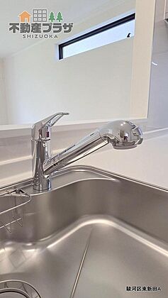 人工大理石カウンターで清潔感があるシステムキッチンには浄水機能付きのシャワー水栓付き!