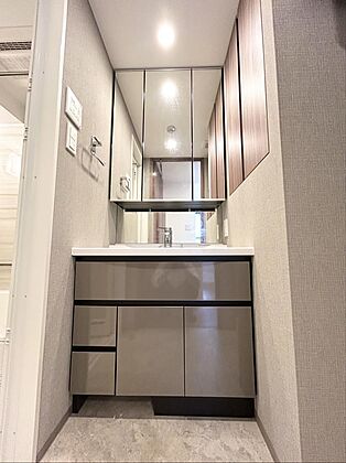 人工大理石を採用した洗面台です!ヘルスメータースペースやポケット収納もございます!