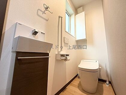 •  1階トイレ。タンクレス・手洗い場が備わっているこだわりのトイレとなっております。