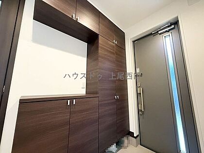 •  【玄関スペース】落ち着きのある木目調のシューズボックスが一際目立つ玄関スペースはゆとりがあり、小物等も置ける設計となっております。