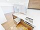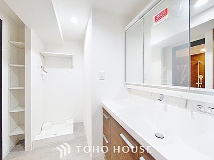 「清潔な印象の洗面室」明るく清潔感のある色調で纏められた洗面室は、機能性に富んだ三面鏡と使い勝手の良い収納を完備した洗面台を設置。洗濯機置場も完備し、大変充実しております。