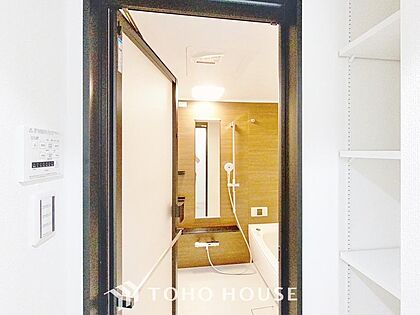「壁面収納×洗面所」洗面所には、トールサイズの壁面収納が設置されています。バスタイムに必要な備品はもちろん、ランドリー用品など様々な収納スペースとして活用して頂けます。