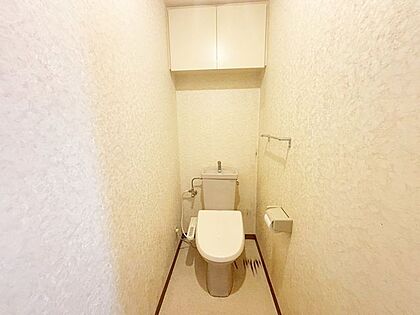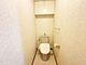 ウォシュレット機能付きのトイレ。収納付きで、便座がスッキリした印象となり、限られた空間を広く見せる効果があります。