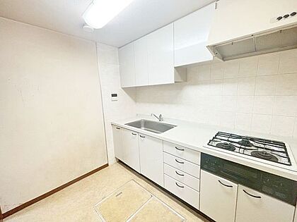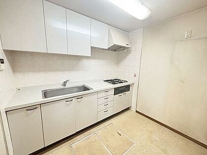 セミクローズドタイプのシステムキッチン。リビングから見えないレイアウトなので、急な来客時も散らかり具合を気にする必要がありません。