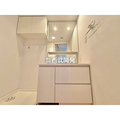 収納力に優れた三面鏡洗面化粧台は鏡の裏側に整髪剤や歯ブラシなどを収納できるのが嬉しいですね。隣には吊戸棚もあり収納力もなかなかのものです。